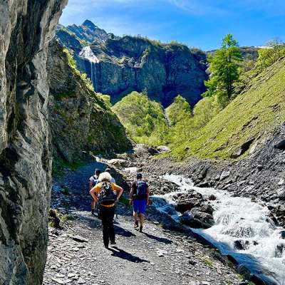 Wir wandern auf einem Teilstück des Sardona Welterbewegs zur imposanten Wasserfallarena Batöni. Am Ziel angekommen, erwarten uns gleich drei spektakuläre Fälle, welche eine Höhe von 81, 86 und 45 Meter aufweisen und uns zum Staunen bringen werden. Das Wasser stürzt über die steilen Klippen und verwandelt den Talkessel von Batöni in ein tosendes Naturspektakel. Dieser Kraftort lädt zum Picknicken und Verweilen ein. Wir lassen uns von der Magie dieses wildromantischen Ortes bezaubern und tanken aufbauende Energie. Zurück zum Ausgangspunt Weisstannen wandern wir auf demselben Weg. Zum Tourenabschluss kehren wir gemeinsam im historischen Alpenhof in Weisstannen ein. (Trittsicherheit erforderlich)