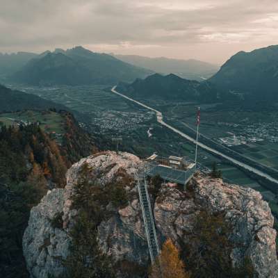 Die Aussichtsplattform Pizalun auf dem St. Margrethenberg bietet eine beeindruckende Rundumsicht auf die Berge von St. Gallen und Graubünden. Sie ist in weniger als einer Stunde von der Talstation des Skilifts Tristeli erreichbar.
