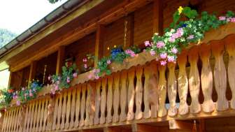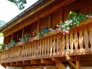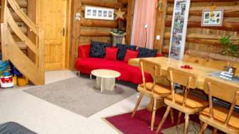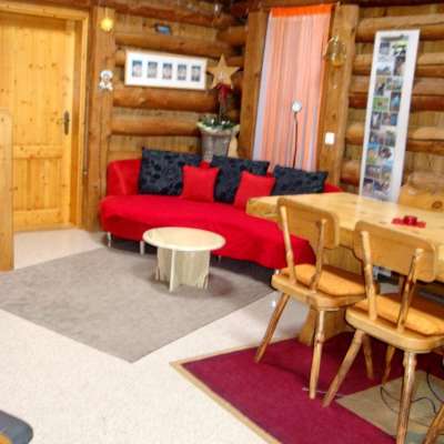 Die Ferienwohnung im ersten Stock ist gemütlich und sehr rustikal eingerichtet. An den Wänden und Decken sind Holzbalken sichtbar. Zur Wohnung gehört eine Veranda.
