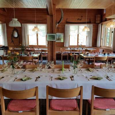 Gutbürgerliche Küche. Grosse Gartenterrasse und Kinderspielplatz. Grosser Parkplatz, ideal für Car, Velo- und Töfffahrer, Postautohaltestelle. Massenlager für 40 Personen und 2 Doppelzimmer."