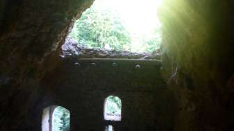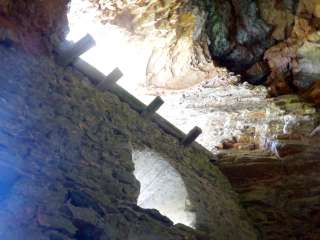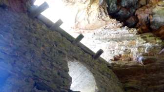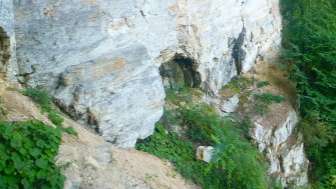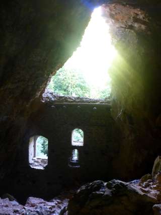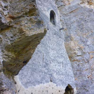 Höhlenburg. Starke Mauer mit Fensterscharten und Hocheingang. Reste von Holzbalken markieren die Lage der zum Hocheingang führenden Lauben und Aussentreppen. Balkenstümpfe auf der Mauerkrone einer Dachkonstruktion oder einem hölzernen Oberbau. Inneres der Höhle weitgehend mit Felsschutt gefüllt. Enge Bresche am Fuss der Aussenmauer erlaubt das Erklettern des Inneren der Höhle.