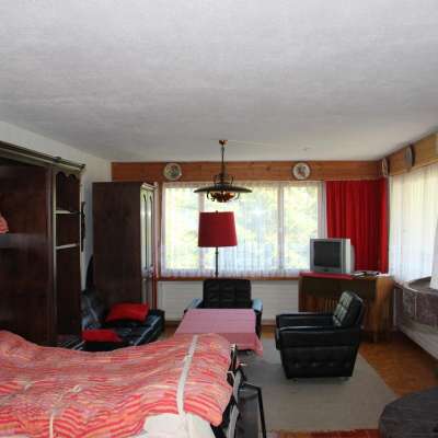 Gartensitzplatz mit Grill, Balkon und nach Absprache zusätzliche Spielwiese. Gemütliche 2 1/2 Zimmer-Wohnung, Wohnschlafzimmer ca. 50 m2 mit D'Klappbett, Kinderzimmer 3 Betten, Küche, Dusche/WC. Die Küche hat eine Mikrowelle anstelle eines Backofens.