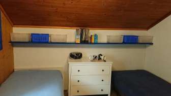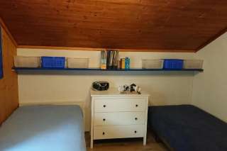 Das gemütliche Haus verfügt über 3 Schlafzimmer. Eines befindet sich in der unteren Etage (zwei Einzelbetten) und in der oberen Etage sind nochmals 2 Schlafzimmer. Eines verfügt über ein Doppelbett und das andere über 3 einzelne Betten.