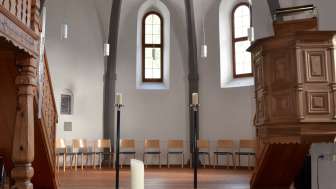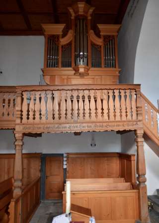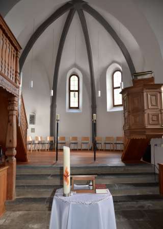 Die Kirche schmiegt sich an den Burghügel, findet Schutz für sich und ihre Besucher. Den Eindruck unterstützen die fast völlig verschlossenen Fassaden gegen Nord und West. Der sakrale, gotische Chorraum steht mit dem Kirchenschiff, welches von Holzeinbauten dominiert wird, im Dialog. Die nord- und westseitig angebrachte Empore wurde aufgrund fehlender Ausbaumöglichkeiten errichtet.