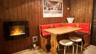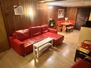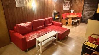 Ledersofa, 2 Relaxstühle und einen Esstisch. Das Leder-Sofa kann als Bett umfunktioniert werden, falls eine Raumtrennung der Schlafzimmer gewünscht wird. Schlafzimmer mit Doppelbett und separatem Etagenbett in Normalgrösse, auch für Erwachsene geeignet.