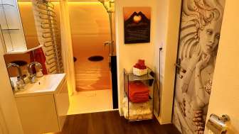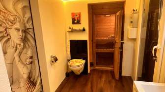 Dusche, WC, Lavabo und eigene Finnische Sauna.