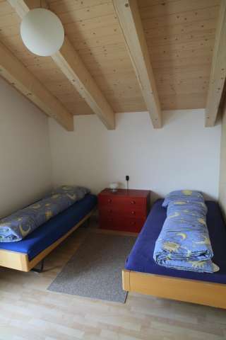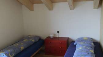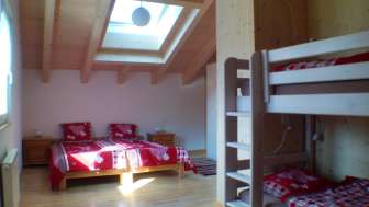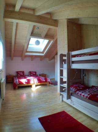 Im 2013 neu erstellten Obergeschoss hat es ein geräumiges Familienzimmer mit einem Doppelbett, einem Kajüttenbett und einem Einzelbett und zwei kleinere Zimmer mit je zwei Einzelbetten.