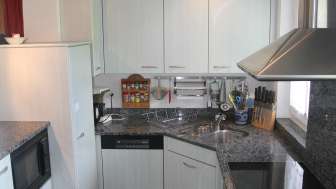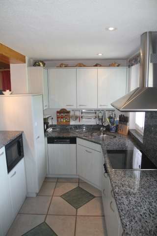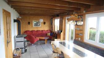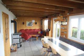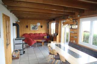 Im Erdgeschoss befindet sich ein weiteres Schlafzimmer mit einem Doppelbett. Es steht zudem ein Babybett zur Verfügung. Bettwäsche ist auf Wunsch vorhanden. Im Wohnzimmer gibt es einen Schwedenofen (Holz im Keller), ein Radio und ein Fernsehgerät. Die grosse Küche ist komplett ausgestattet (Fondue, Raclette, usw.) und verfügt über eine Geschirrspülmaschine, einen Kaffee-Vollautomaten und einen grossen Kühlschrank.