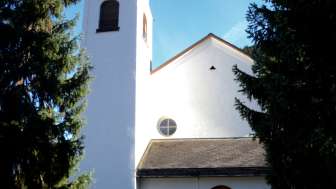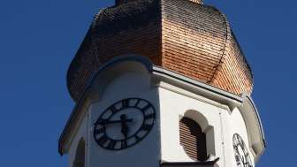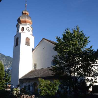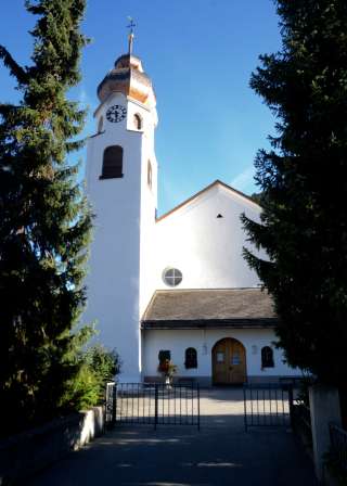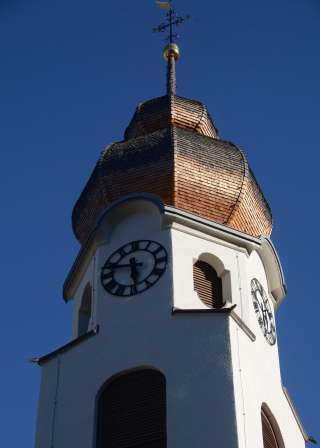 Unser Blick wird vom schindelgedeckten Doppelzwiebelturm magisch angezogen, fährt über den achteckigen Turmaufsatz hinunter zum nicht weniger harmonischen Kirchenschiff. Das saalartig weite Schiff und der polygonale Chor verleihen der Kirche eine ansehnliche Grösse. Einige Statuen im Innern stammen aus dem ehemaligen Hochalter von ca. 1550.