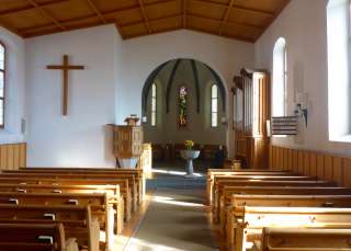 Zurückhaltender, aber prominent platzierter Bau, zwischen Rat- und Sprecherhaus. Der schlanke, Zwiebelhaupt gekrönte Barock-Turm dominiert das nach einem Dorfbrand 1745 erbaute Kirchenschiff. Gemalte Eckquader und Farbgebung erinnern an das weiter östlich liegende Pfarrhaus, das Salishaus. Bemerkenswerte Grabsteine aus dem 17.-19. Jh. zieren die Aussenwand und den Friedhof.