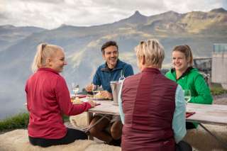 Geniessen Sie im höchstgelegenen Gastronomiebetrieb am Flumserberg die Panoramaaussicht auf die umliegende Bergwelt. Lassen Sie Ihren Blick auf der einen Seite entspannt über die Weite des Spitzmeilen-Gebiets mit dem charakteristischen Wahrzeichen, dem 2501 m hohen Spitzmeilen, schweifen oder werden Sie auf der anderen Seite von der magischen Churfirsten- und Alvierkette mit ihren zackigen Gipfeln hoch über dem Walensee verzaubert.