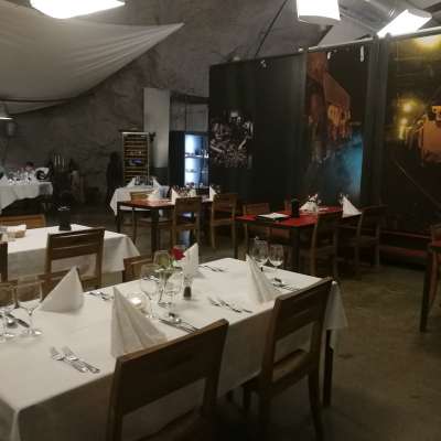 Umgeben von der Pracht des massiven Felsgesteins befindet sich in der Eingangszone zum Bergwerk ein elegantes Restaurant mit klassischen, Schweizer Spezialitäten.