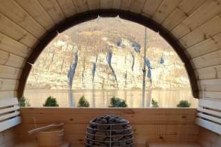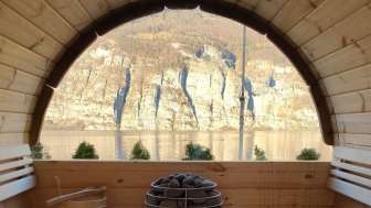 Entspannung pur im Saunafass des Hotel Schiffahrt Mols – mit Panoramablick auf die Berge, privater Nutzung & nordischem Flair.
