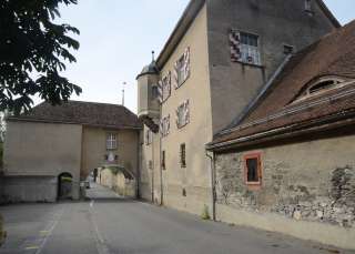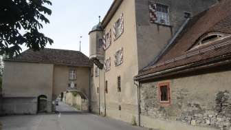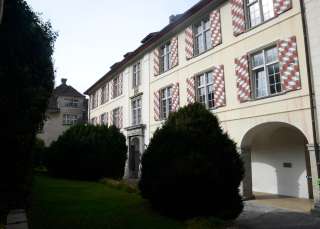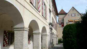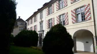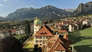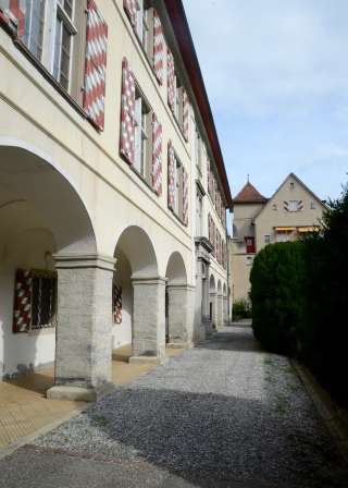 Sie haben den Torbogen der Villa Maria durchschritten und stehen im Ehrenhof des ehemaligen Sitzes der Familie Salis-Zizers. Das dreigeschossige, barocke Schloss wird dreiseitig von Arkaden mit massiven Säulen und einem talseitigen Park umfasst. Der achteckige, von einer Kuppelhaube bedeckte Turm ist die Landmarke der Region Zizers und bildet die Mitte des Schlosses ab.