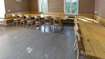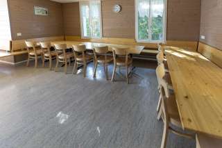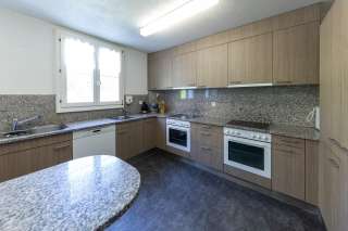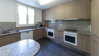Gemütlicher Speise- und Aufenthaltsraum mit schöner Aussicht. Sehr gut eingerichtete Küche mit zwei Elektroherden, grosser Kühlschrank, Tiefkühler, Geschirrspüler, Doppelspüle sowie Durchreiche in den Speise- und Aufenthaltsraum.