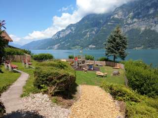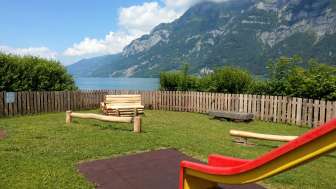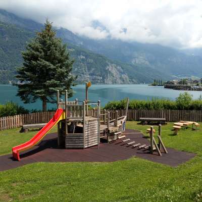 Zum Kapitän kannst du auf diesem Spielplatz gleich selber werden: am Steuerrad des kleinen Holzschiffes mit Balancierseilen, Rutsche und Wackelbrücke. Das kleine Karussell lässt die Welt ein bisschen schneller drehen, auf der Slackline erprobst du dein Gleichgewicht, durch Fernrohre erforschst du den Horizont und auf Baumstämmen sammelst du frische Kräfte. Die Rutschbahn führt die Kinder schnell vom Schiff herunter. Die Eltern können auf Holzbänken den Kindern beim Spielen zusehen oder den Ausblick auf den Walensee geniessen.