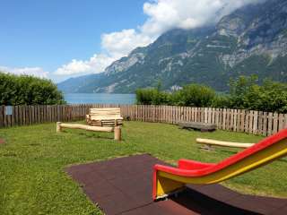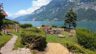 Das Spielerlebnis Walensee in Unterterzen bietet ein Abenteuer für Familien mit einem Themenspielplatz, der ein kleines Holzschiff, Balancierseile und eine Rutsche umfasst. Eltern können die Aussicht auf den Walensee geniessen.