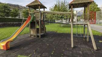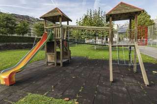 Ein Spielplatz mit zwei Spieltürmen, die mit einer Rutschbahn und verschiedenen Kletterelementen ausgestattet sind. Dazu kommen Schaukeln, ein Drehrad, Balancierstangen und ein Sandkasten, der zum Buddeln und Spielen einlädt. Der gesamte Bereich bietet viele Möglichkeiten für Kinder, sich auszutoben und ihre motorischen Fähigkeiten zu entwickeln, während sie gleichzeitig Spass und Abenteuer erleben.