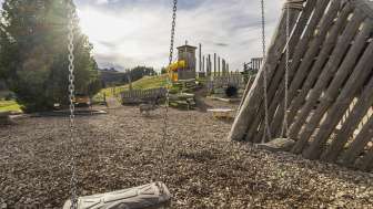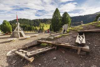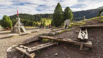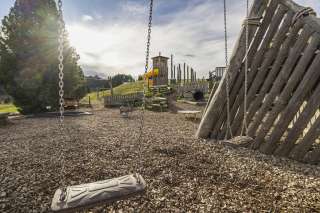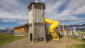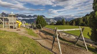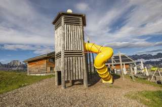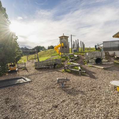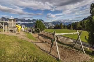 Der große Spielplatz bietet eine Vielzahl an spannenden Aktivitäten für Kinder und sorgt für stundenlangen Spaß. Zu den Highlights gehören eine aufregende Zipline, auf der die kleinen Abenteurer durch die Luft fliegen können, sowie ein kleines Trampolin, das zum Hüpfen und Springen einlädt. Für rasante Fahrten sorgt die Rundrutschbahn, die bei allen Kindern besonders beliebt ist. Ein Wasserspiel bietet an warmen Tagen erfrischende Abkühlung und jede Menge Wasserspaß. Zudem gibt es Schaukeln, auf denen man hoch hinauf schwingen kann, und Kletterelemente, die die Geschicklichkeit und den Mut der Kinder herausfordern. Der Spielplatz liegt direkt neben der Terrasse des Restaurants und bietet eine ideale Möglichkeit für Familien, entspannt zu speisen, während die Kinder sich austoben.