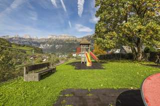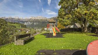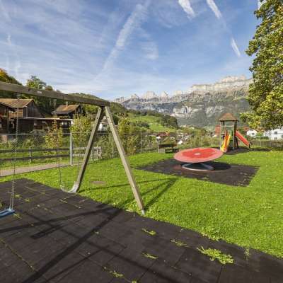 Der Spielplatz Bildstöckli in Flums bietet einen Spielturm mit Rutschbahn und Kletterelementen sowie zwei Schaukeln, die besonders für ältere Kinder geeignet sind. Ein idealer Ort für Spiel und Spass.