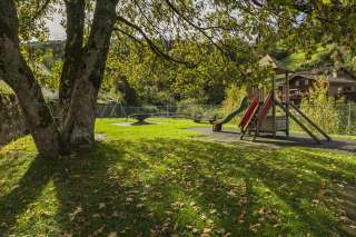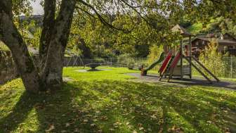 Ein Spielplatz mit einem Spielturm, der mit einer Rutschbahn und einpaar Kletterelementen ausgestattet ist. Zusätzlich gibt es zwei Schaukeln, die besonders für die grösseren Kinder geeignet sind und ihnen viel Spass beim Schwingen bieten.