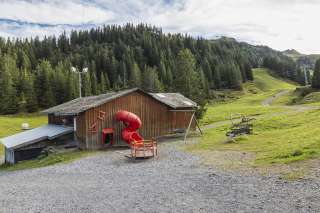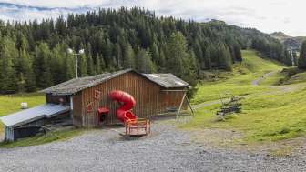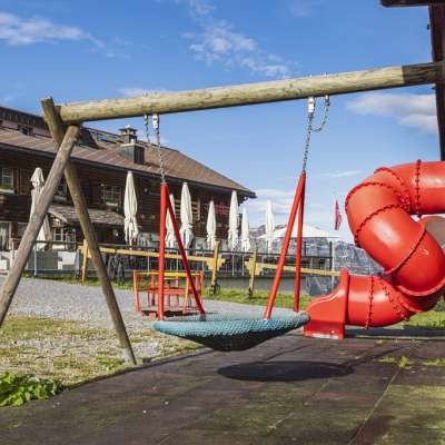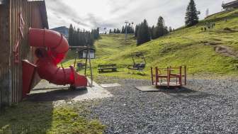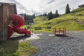 Ein sehr kleiner Spielplatz in den Bergen, ideal für Momente in der Natur. Hier finden die Kinder eine klassische Rohr-Rutsche, die aus einem Haus herabführt, ein Drehrad für fröhliches Drehen und Lachen sowie eine Hängemattenschaukel, die einen herrlichen Ausblick auf die Berglandschaft bietet. Ganz in der Nähe befindet sich das Restaurant Chrüz, sowie die Rodelbahn «Floomzer».