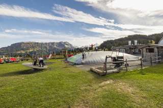 Ein abwechslungsreicher Spielplatz mit einem Hüpfkissen und einer Hüpfburg, die den Kindern viel Raum für energievolles Springen und Toben bieten. Es gibt mehrere Schaukeln, die sowohl für kleinere als auch für größere Kinder geeignet sind. Ein Spielturm mit Kletterelementen und einer kleinen Rutschbahn lädt zu Abenteuern und ersten Kletterversuchen ein. Außerdem sorgt ein spezieller Veloparcours für die Kleinen dafür, dass sie mit ihren Fahrrädern oder den vorhandenen Laufrädern sicher fahren und ihre Geschicklichkeit verbessern können. Ein Ort voller Bewegung und Spaß für Kinder unterschiedlichen Alters! In der Nähe befindet sich das Restaurant Prodalp, sowie der Kletterturm «Cliimber».