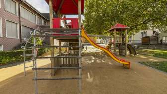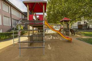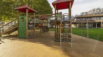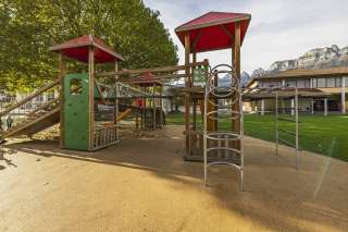 Der Spielplatz hat drei Türme mit verschiedenen Kletterelementen, wo die Kleinen ihre Geschicklichkeit und ihren Mut unter Beweis stellen. Zwei Rutschbahnen sorgen für rasante Abfahrten und bieten jede Menge Spass. Zusätzlich laden mehrere Schaukeln dazu ein, hoch in den Himmel zu schwingen und den Wind zu spüren. Ein perfekter Ort, um sich auszutoben und neue Abenteuer zu erleben!