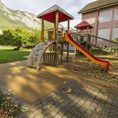 Der Spielplatz Schule Flums bietet drei Türme mit Kletterelementen, zwei Rutschbahnen und mehrere Schaukeln. Ein idealer Ort für Kinder, um Geschicklichkeit zu testen und neue Abenteuer zu erleben.