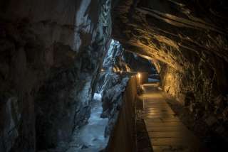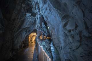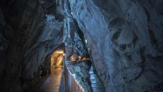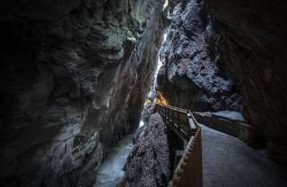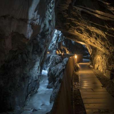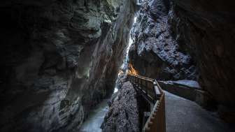 Die Taminaschlucht bei Bad Ragaz bietet einen 450 Meter langen, sicheren Weg zur Quellwasser-Grotte. Hier sprudeln 8000 Liter Thermalwasser pro Minute aus Europas ergiebigster Akratotherme mit einer konstanten Temperatur von 36,5 °C.