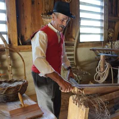 Riffeln, dreschen, rösten, brechen, hecheln, spinnen, weben und nähen.