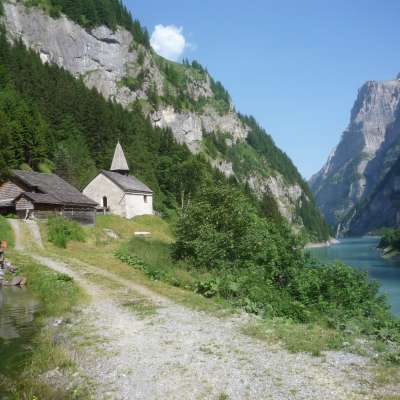 Die Walsersiedlung Sankt Martin im Calfeisental bietet eine historische Atmosphäre mit kleinen Holzhäusern und einem Restaurant. Die Anreise über den Gigerwald Stausee ist ein Erlebnis. Der Piz Sardona markiert das Ende des Tals.