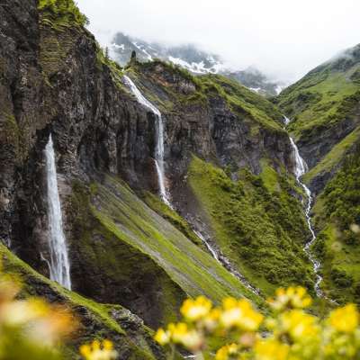 Sie stehen vor dem 81 Meter hohen Piltschinabachfall (links), dem Sässbachfall (86 m hoch, Mitte) und dem Muttenbachfall (45 m hoch, rechts). Etwas weiter oben mündet der Lavtinabach in den Piltschinabach und etwas weiter unter der Guetentalbach in den Gufelbach. Sie befinden sich an einem fünfarmigen Wasser-Kraftort, der zu einer imposanten Felsarena ab-getragen worden ist. Nicht nur der Anblick ist überwältigend, auch die Energien sind äusserst hoch und aufbauend.