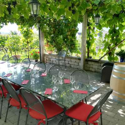 Weingutsbesichtigung mit Weindegustation und Imbiss im rustikalen Weinstübli oder in der mit Reben bewachsenen Pergola mitten im Weinberg.